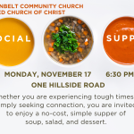 In response to the current federal shutdown and no SNAP benefits for November (as of yet), GCCUCC welcomes our neighbors in need to a Social Supper on Monday evening, November 17 at 6:30 PM. Much like the traditional Agape meals, we will serve a simple supper of soup, bread, salad, and dessert at NO COST